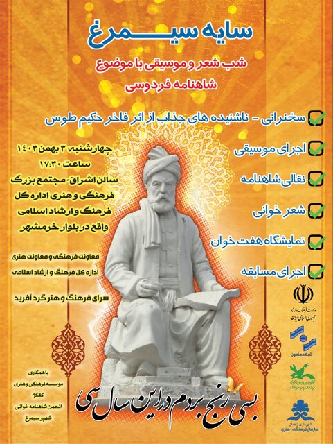 صیاد ادامه داد: به همین منظور مراسم شب شعر موسیقی سایه سیمرغ روز چهارشنبه سوم بهمن ماه ساعت ۱۷:۳۰ با موضوع شاهنامه فردوسی در سالن اشراق مجتمع بزرگ فرهنگی و هنری اداره کل فرهنگ و ارشاد اسلامی سیستان و بلوچستان واقع در بولوار خرمشهر برگزار می‌شود.
